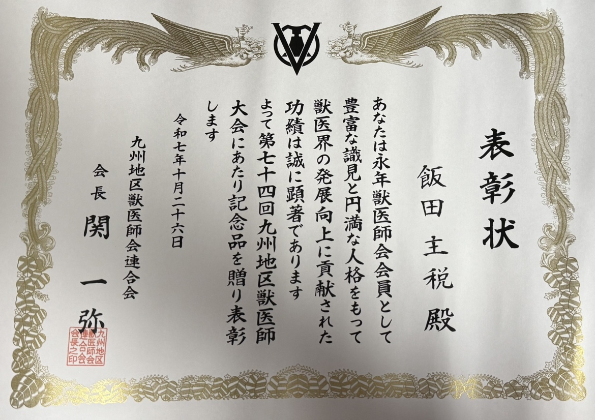 いいだ動物病院では、この度、地域医療・動物福祉への長年の貢献が評価され 功労賞を受賞いたしました。